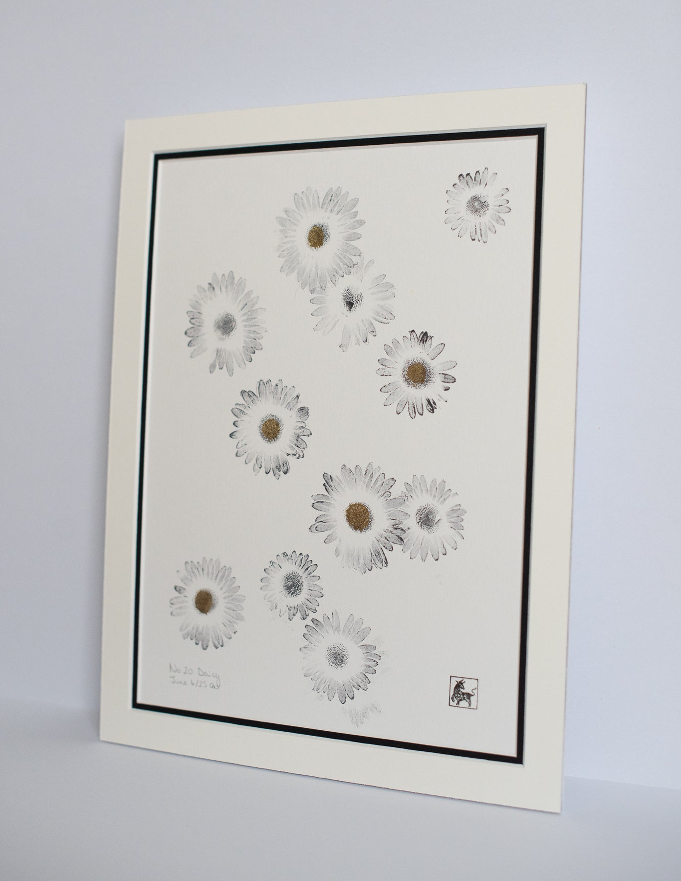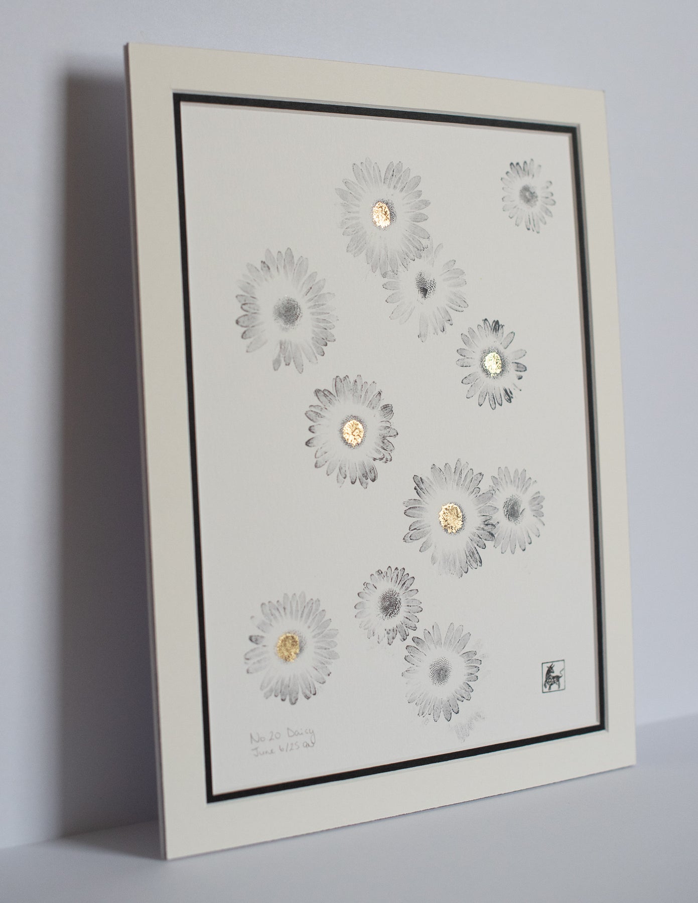 - Art is created by stamping the leaves and petals of the flower in ink and also gold leaf