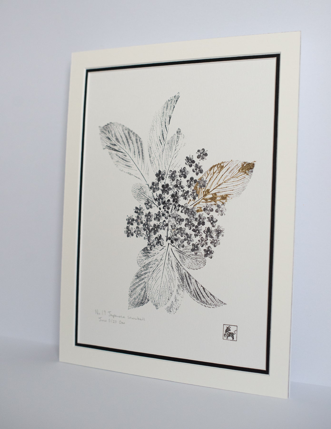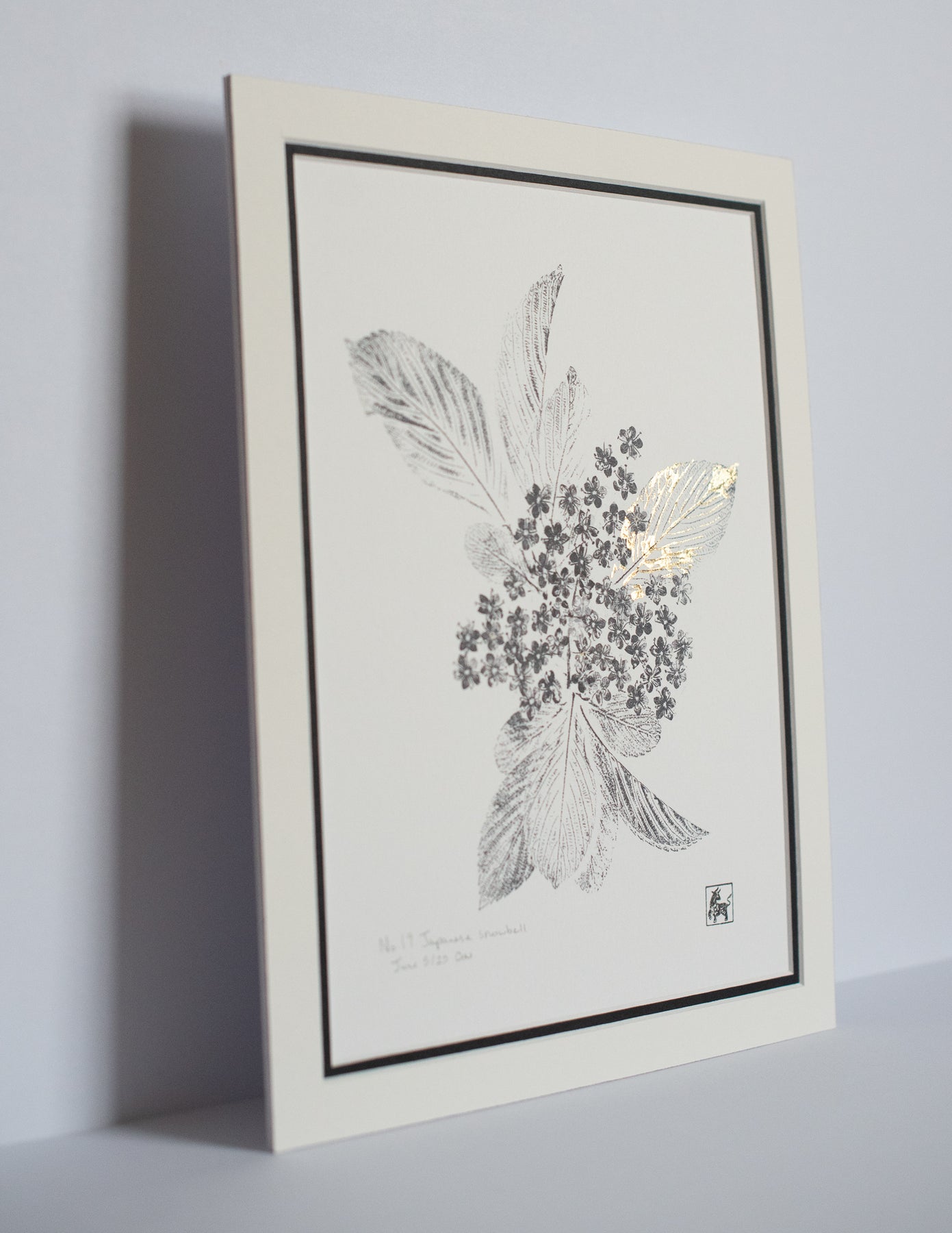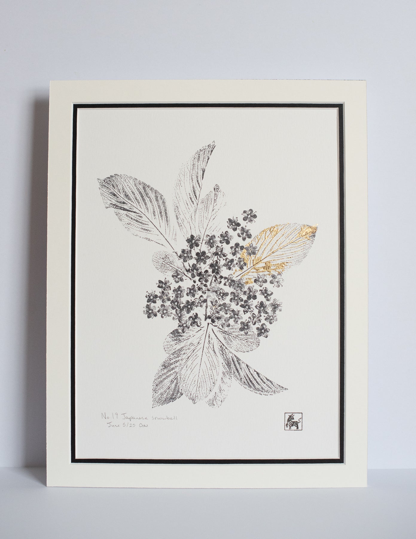 - Art is created by stamping the leaves and petals of the flower in ink and also gold leaf