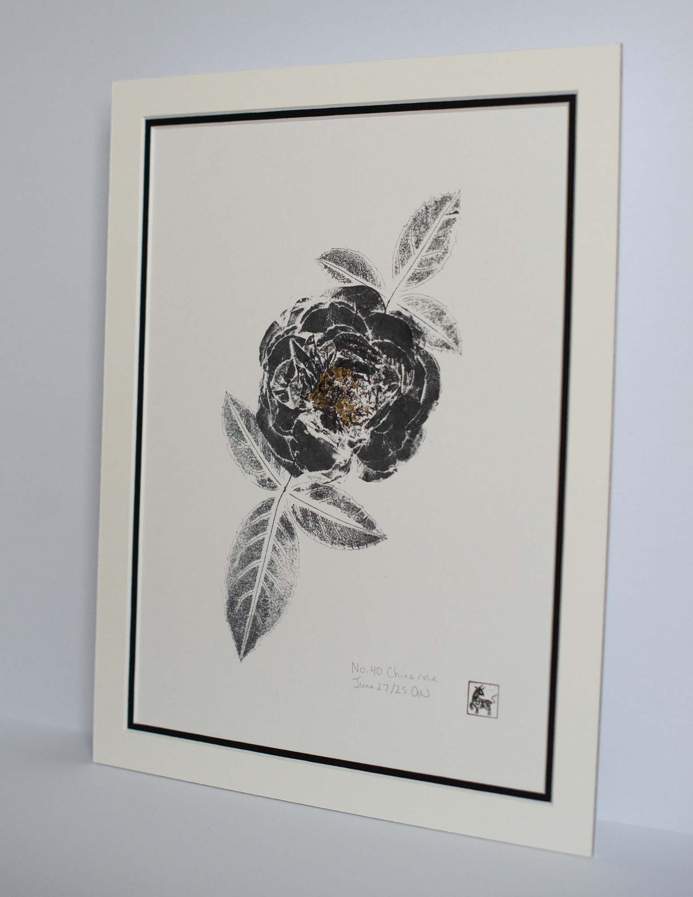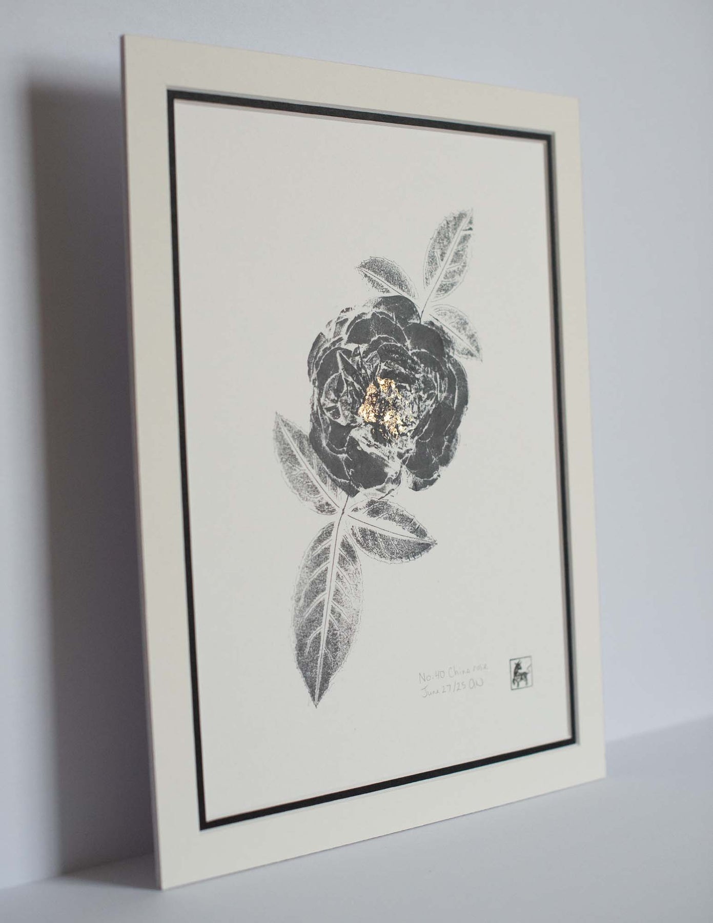 - Art is created by stamping the leaves and petals of the flower in ink and also gold leaf